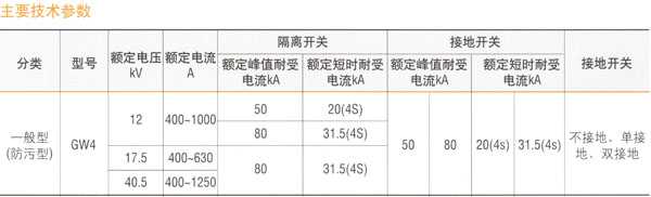 - 三相交流50Hz户外高压开关设备,用于电压10~110KV的电力系统中,供在有电压无负载时分合电路之用,以及对被检修的高压母线、断路器等电器设备与带电的高压线路进行电器隔离之用。其中防污型的隔离开关可满足重污秽地区用户的要求,并可以有效地解决隔离开关在运行中出现的污闪问题。 GW4系列与CJ2、CJ5、CJ6、CJ11系列电动操动机构组合,特别适合电力系统和电气化铁路领域对远距离分、合的需要。额定电流:200A~4000A。