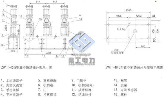 ZW7-40.5型系列户外高压真空断路器系三相交流50Hz,额定电压为40.5kV的户外高压电器。附装弹簧操动机构或电磁操动机构,可以远控电动分、合闸,也可就地手动储能手动分、合闸。设计性能符合GB1984-89《交流高压断路器》国家标准的要求,并满足IEC-56《高压交流断路器》国际电工委员会标准的要求。